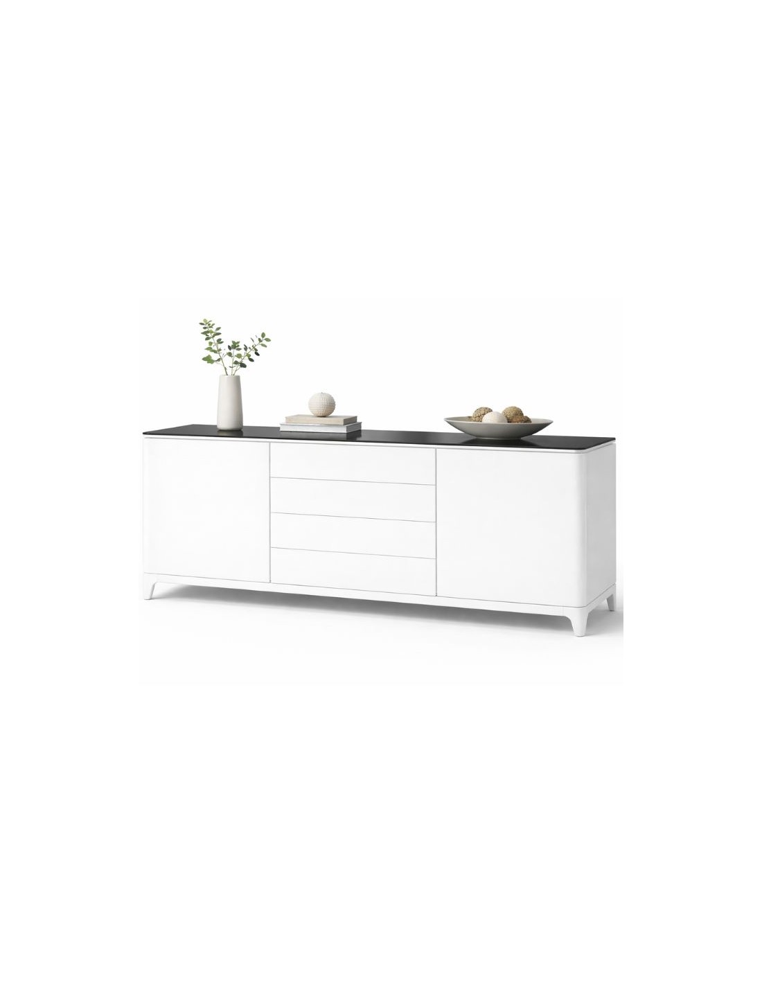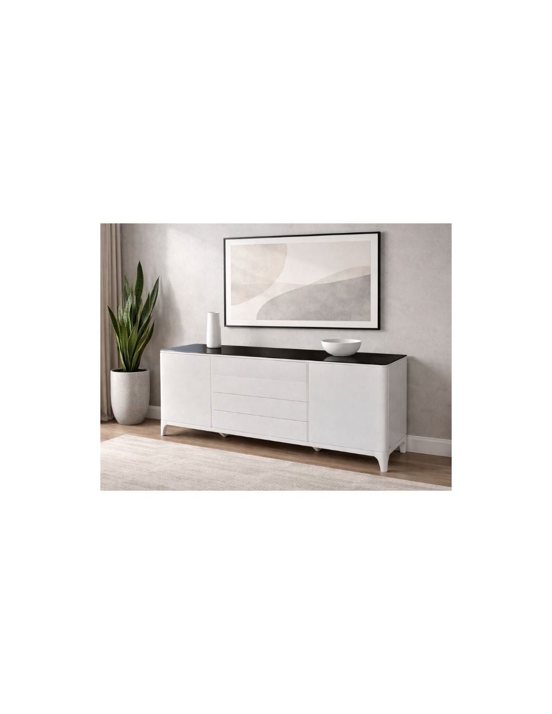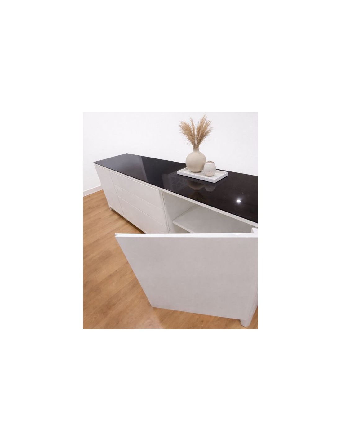 A sideboard that is manufactured in white lacquer with extra black tempered glass.