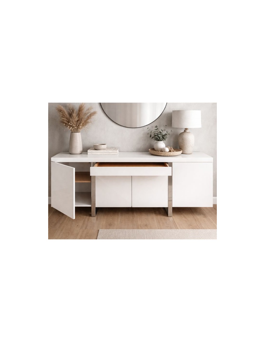 The glossy white lacquer adds a modern aesthetic, while the chromium legs provide shine and sophistication.