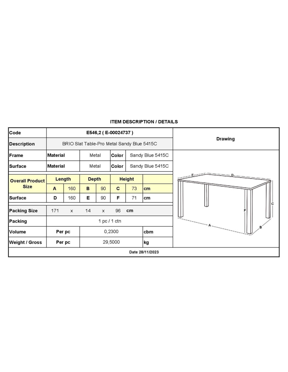 BRIO Slat Table-Pro 160x90cm Metal Sandy Blue 5415C